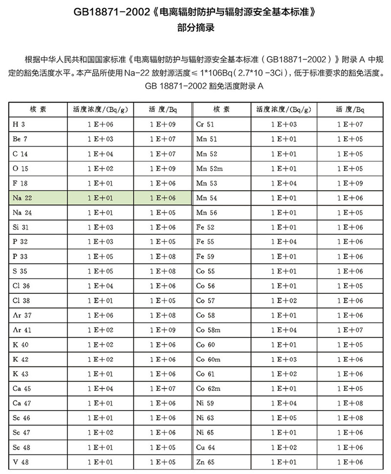 ◎ 放射源 Na-22 輻射活性低,對(duì)人體無(wú)害。